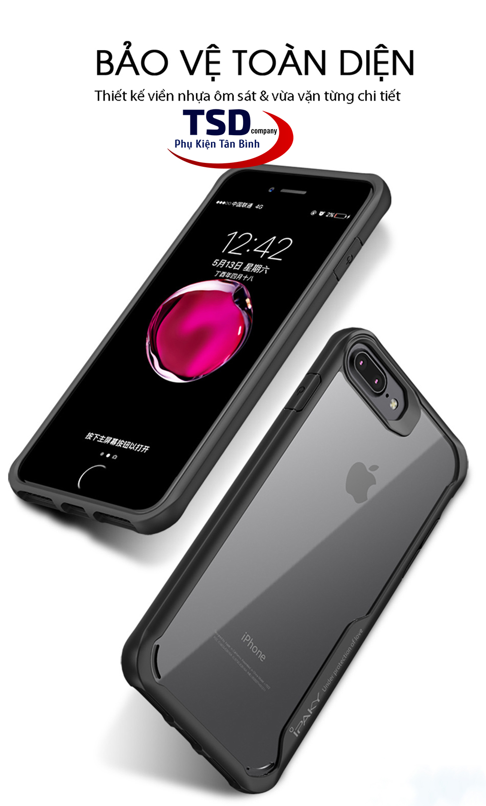 - Tiêu chuẩn chống sốc thiết kế 4 góc dày hơn hạn chế tác động tới điện thoại khi rơi hoặc va chạm mạnh, các góc được bo viền cao su dày dặn hơn so với mặt, giảm tối đa sự va chạm mạnh nào đến máy, vừa giúp ốp bám chắc vào máy, vừa mạng lại sự an toàn tối đa cho điện thoại. - Các nút bấm được thiết kế nút giả ấn rất mềm mại và nẩy cho cảm giác trải nghiệm tuyệt vời khi ấn không phải quá mạnh tay mà vẫn nhạy. - Ốp lưng Ipaky iPhone trong suốt giúp bạn khoe chiếc iPhone 7 Plus, 8Plus với vẻ đẹp zin, ốp lưng Ipaky này không chỉ bảo vệ toàn bộ phần lưng mà còn cao hơn màn hình vô cực của điện thoại trên bề mặt phẳng tốt hơn trên bề mặt phẳng. - Ốp lưng Ipaky iPhone chống sốc cho cảm giác cầm rất đầm tay, bám và cho trải nghiệm vô cùng thoải mái khi sử dụng. - Phần camera sau cũng được bảo về bởi một lớp viền cao su đen so với mặt ốp trong, chính vì thế phần cam cũng được bảo về một cách tốt nhất, tránh sự trầy xước không đáng có. Toàn bộ ốp lưng Ipaky iPhone 7 Plus, 8 Plus đều làm từ cao su mềm nên người dùng có thể an tâm khi sử dụng mà không lo bị vỡ, nứt ốp như những loại ốp nhựa cứng mỏng dính.