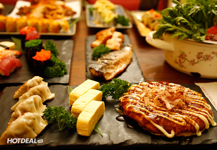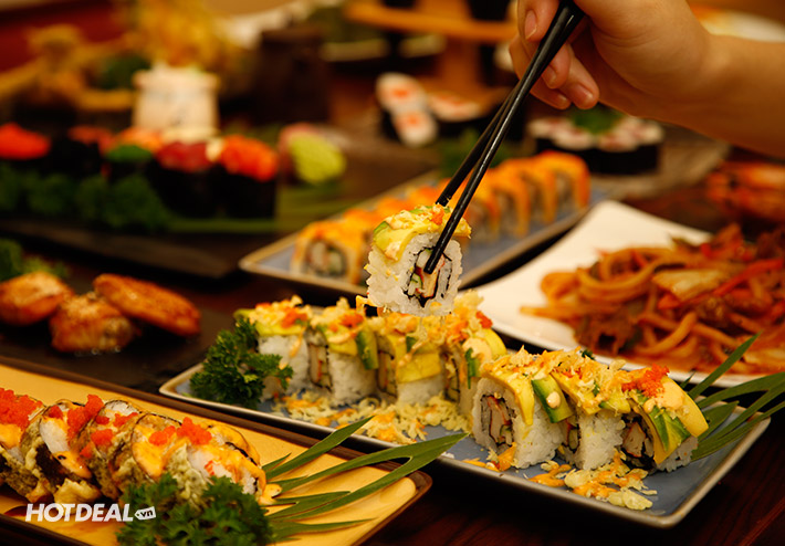 Ngoài ra, thực khách còn được dùng không giới hạn các loại Sushi như Nigari, Maki và Gukan. Các món cơm cuộn vô cùng hấp dẫn như cá ngừ trộn sốt cay (mè/trứng cá chuồn/ sốt Osaka), tôm sú hấp, cá kiếm tempura, lươn Nhật, phô mai, thanh cua, trứng cá chuồn, sốt Osaka (chiên), cá hồi hấp… sẽ làm thỏa mãn khẩu vị các thực khách mê món Nhật. Bên cạnh đó là các món mì Udon nổi tiếng Nhật Bản như mì udon xào thịt gà, mì udon xào thịt bò, mì udon xào với nấm, mì udon xào bò & kim chi… với hương vị đậm đà. Với hơn 80 món ăn, thực khách sẽ thoải mái cảm nhận các hương vị khác nhau của ẩm thực Nhật Bản.