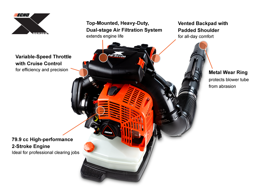 PB-9010H ECHO X Series MSRP | $699.99 Unleash power with the ECHO X Series PB-9010H a 79.9 cc backpack blower delivering 48N of force, 220 MPH Hairspeed, and 1,110 CFM. Built for pros, it clears debris fast with less effort. Padded straps and a vented back pad ensure all-day comfort and control.
