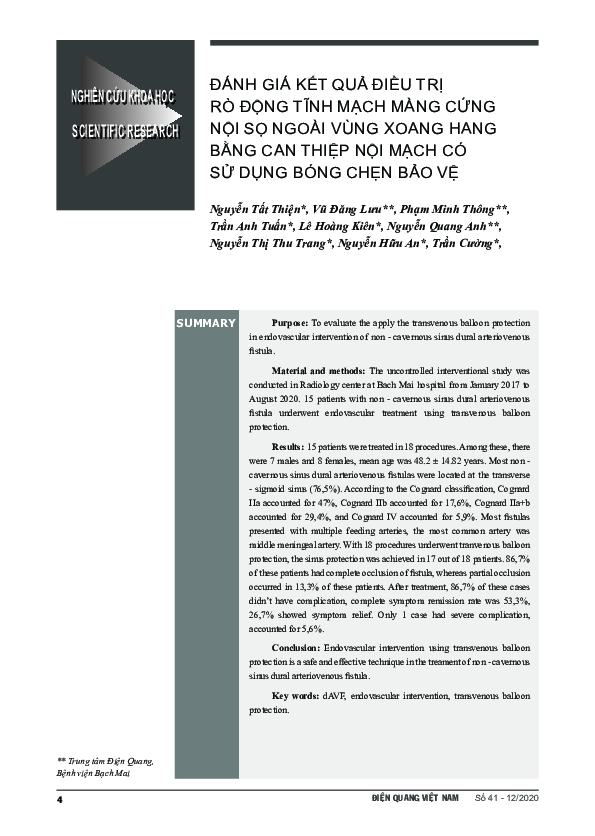 Mục đích: đánh giá ứng dụng của kĩ thuật sử dụng bóng chẹn bảo vệ xoang tĩnh mạch trong can thiệp nội mạch điều trịrò động tĩnh mạch màng cứng ngoài vùng xoang hang.Đối tượng và phương pháp nghiên cứu: nghiên cứu được tiến hành trong thời gian từ tháng 1/2017 đến tháng 8/2020,tại Trung tâm Điện quang, Bệnh viện Bạch Mai, trên 15 bệnh nhân có RĐTMMC ngoài vùng xoang hang, được điều trị bằngphương pháp can thiệp nội mạch có sử dụng bóng chẹn bảo vệ. Nghiên cứu can thiệp không đối chứng tiến cứu.Kết quả: Trong 15 bệnh nhân, với 18 lần can thiệp, có 7 bệnh nhân nam, 8 bệnh nhân nữ, độ tuổi trung bình 48.2 ± 14.82.Dị dạng ngoài xoang hang hay gặp nhất ở xoang ngang – sigma (76,5%), phân loại dị dạng theo Cognard gồm có 47% (8/17)thuộc loại II a theo Cognard, 17,6% (3/17) thuộc loại II b, 29,4% (5/17) thuộc loại II a+b, và 5,9% (1/17) bệnh nhân thuộc loạithuộc loại IV. Đa số dị dạng có nhiều cuống nuôi, tỷ lệ trung bình 3.42 ± 1.35 cuống/ dị dạng, nhánh hay gặp nhất là ĐM màngnão giữa. Vớ...