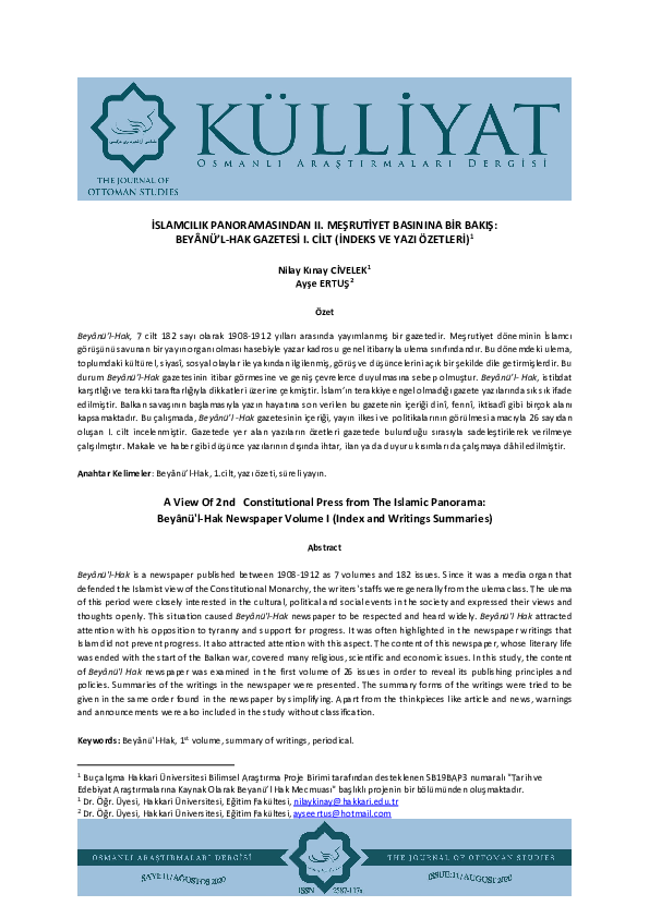 İSLAMCILIK PANORAMASINDAN II. MEŞRUTİYET BASININA BİR BAKIŞ: BEYÂNÜ'L-HAK GAZETESİ I. CİLT