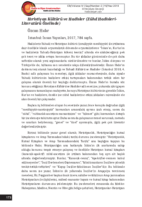 Hıristiyan Kültürü ve Hadisler (Zühd Hadisleri- Literatürü Özelinde) - Özcan HıdırHadis ve Siyer Araştırmaları Hadith and Sira Studies