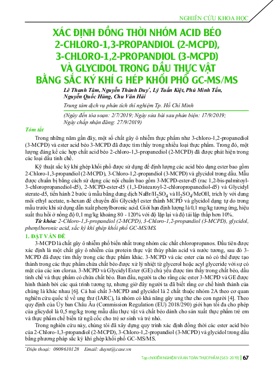 Xác định đồng thời nhóm Acid béo 2-Chloro-1,3-Propandiol (2-MCPD), 3-Chloro-1,2-propandiol (3-MCPD) và glycidol trong dầu thực vật bằng sắc ký khí ghép khối phổ GC-MS/MS