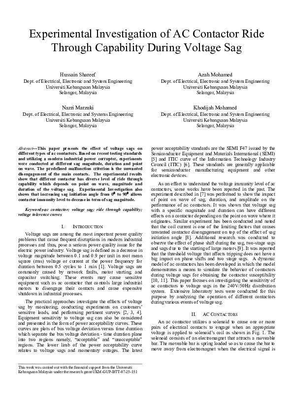 Experimental Investigation of AC Contactor Ride Through Capability During Voltage SagHussain Shareef