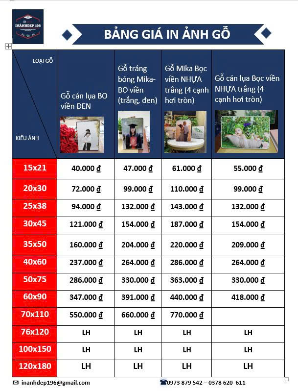 + Gỗ 15×21 Gỗ cán lụa bọc viền nhựa trắng hoặc màu bạc giá 55k/1c, gỗ 20×30 giá 100k/1c, ngoài ra còn rất nhiều cơ khác theo như bảng giá phía trên ạ