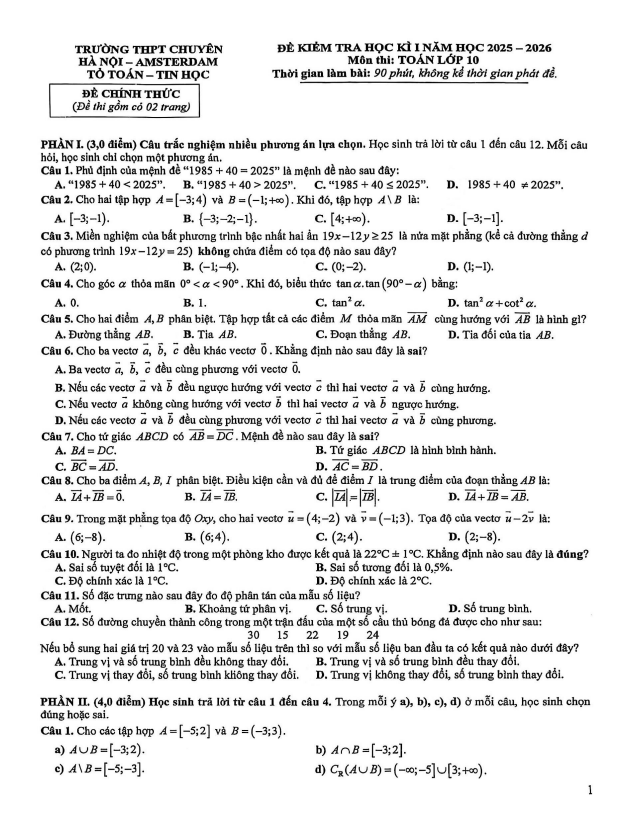 Đề học kì 1 Toán 10 năm 2025 – 2026 trường THPT chuyên Hà Nội – Amsterdam 22/12/2025