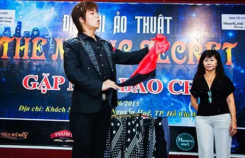 Ảo thuật gia Trần Dũng thuộc gia đình ba đời làm ảo thuật đang trình diễn tại buổi công bố Đại hội ảo thuật The Magic Secret 2015 tại TP.HCM. Ảnh: QUỲNH TRANG