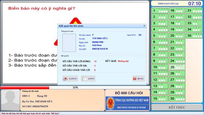 Các bạn chỉ cần nhớ rằng điểm yêu cầu đạt của hạng thi B2 là 32/25 câu hỏi, ở đây chúng ta đạt số câu trả lời đúng là 31/35 nên kết quả sẽ là “Không đạt”