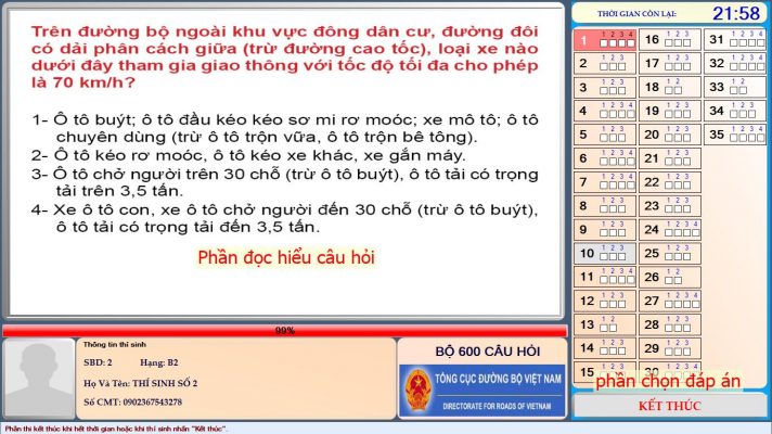 Hình ảnh thực tế về giao diện của phần thi lý thuyết bằng lái xe B2