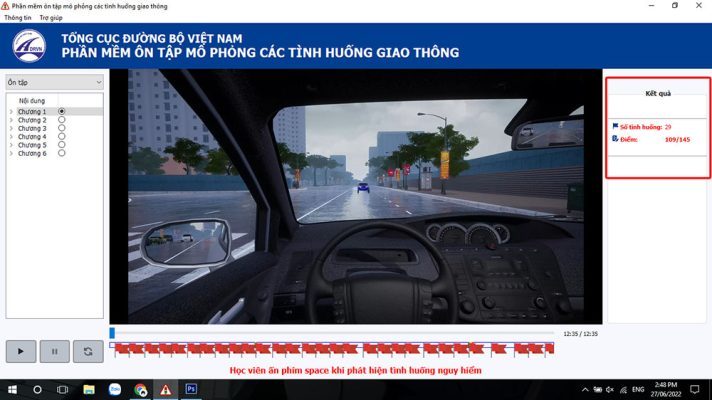 Học viên cần trả lời 10 câu hỏi tổng hợp trong 120 câu xử lý tình huống. Số điểm để vượt qua phần thi mô phỏng này thí sinh cần đạt tối thiểu 35 điểm trên 10 câu hỏi. Tức tối thiểu phải được 7 câu đạt điểm tối đa là 5 điểm. Ở hình trên chúng ta cần thêm 2 điểm nữa để đạt đủ 35 điểm trong bài thi này.