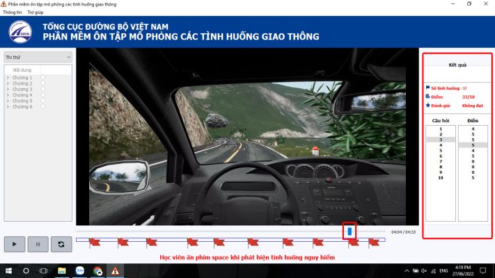 - Sau khi chạy hết video tình huống phần mềm sẽ hiển thị kết quả. Vị trí cột cờ xuất hiện nằm trong khoảng màu Xanh – Đỏ là thời điểm bạn có điểm. Thang điểm được tính từ 5 – 1 tùy vào thời điểm bạn lựa chọn xử lý.