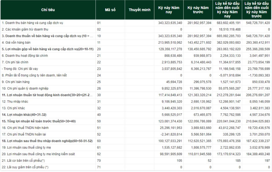 Doanh thu tăng trưởng so với cùng kỳ khoảng 22%, đạt 343 tỷ đồng; lũy kế doanh thu cho đến quý 3 năm 2021 đặt 683 cao hơn so với lũy kế cùng kỳ năm trước khoảng 16%. Tuy nhiên biên lợi nhuận của doanh nghiệp sụt giảm ở mức 37% trong khi năm ngoái đạt mức 49%.