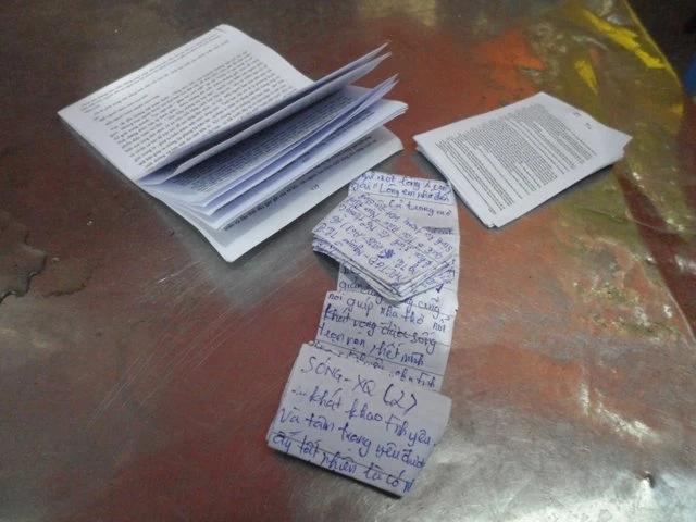 Những tệp phao thi với dòng chữ siêu nhỏ được sĩ tử bỏ lại sau khi ra khỏi phòng thi. Ảnh: Nguyễn Trà.