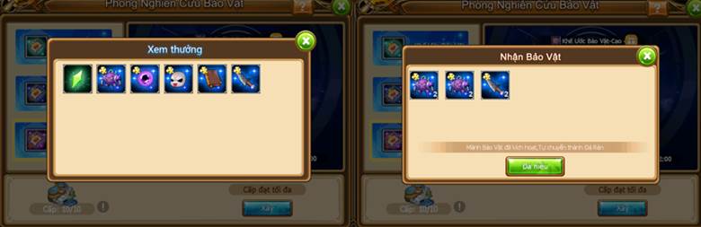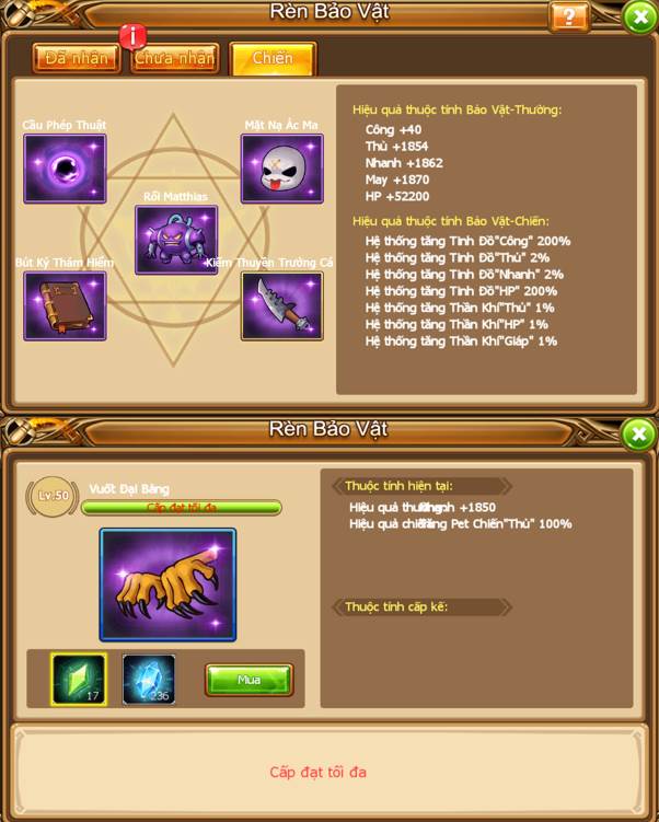 - Để tăng cấp bảo vật cần Đá Rèn. Cấp tối đa bảo vật là 50.