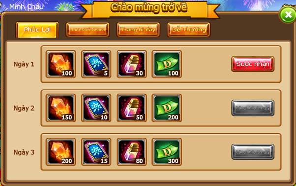 - Người chơi từ cấp 20, đã offline 30 ngày trở lên, khi online trở lại game, tùy thuộc vào cấp nhân vật và thời gian mở máy chủ sẽ kích hoạt tính năng Người Chơi Cũ, tặng thưởng cho người chơi.