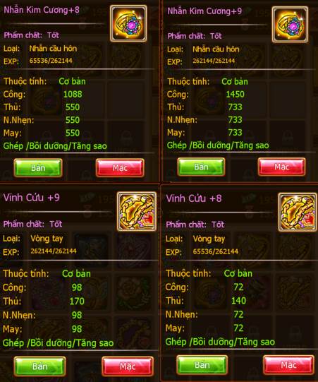- Mở rộng cấp bồi dưỡng của các loại : Vĩnh Cửu, Vòng Tay Venus, Nhẫn Hạnh Phúc, Nhẫn Kim Cương từ +7 lên +9