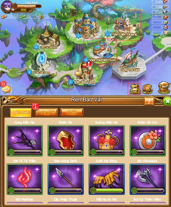 - Khi đủ số lượng mảnh, vào Bảo Vật > Chưa nhận để kích hoạt bảo vật.