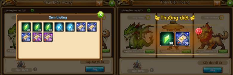 - Tăng cấp Thần Điện Hoang có thể mở Boss cấp cao, tăng lượt mua (Thần Điện Hoang Lv1 = 1 lượt, Lv5 = 5 lượt, Lv10 = 10 lượt, mỗi lượt mua = 100 xu ) và x * phần thưởng khi diệt boss (Thần Điện Hoang Lv1 = x1 phần thưởng, Lv5 = x2 phần thưởng, Lv10 = x3 phần thưởng)