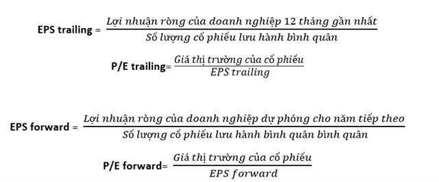 P/E ở trên là cách tính hay dùng. Trên thực tế, nhà đầu tư còn gặp phải chỉ số P/E trailing và P/E forward (hay còn được gọi dưới cái tên Leading P/E hay Prospective P/E). Với P/E trailing, nhà đầu tư sẽ sử dụng EPS của 12 tháng gần nhất. Trong khi đó, P/E forward lại sử dụng EPS dự phóng cho năm tiếp theo. Với P/E trailing và P/E forward, phần tử số vẫn sử dụng giá thị trường của cổ phiếu như công thức gốc ban đầu.