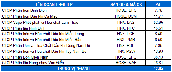 Để thực hiện định giá theo P/E, điều đầu tiên cần làm là tìm danh sách các công ty tương đương trên thị trường. Sau đó, tổng hợp giá trị P/E của các công ty này. Ta có bảng danh sách như ở bên dưới. Kết quả mong muốn từ bảng này là kết quả trung vị P/E của toàn ngành. Theo đó, P/E trung vị tại thời điểm định giá ở mức 12.85.