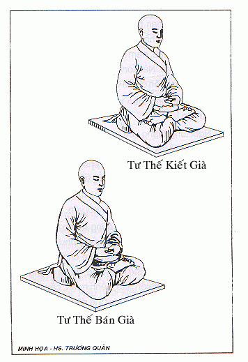 Ngồi lưng thẳng vừa phải, đừng quá ưỡn cũng đừng để cong hoặc ẹo, đầu hơi cúi (lưng còng và đầu cúi dễ sanh hôn trầm) chiều chóp mũi ngay đầu ngón tay cái, hai trái tai đối xứng với bả vai, mắt mở 1/3, tầm nhìn không quá 6 tấc từ giao điểm giữa hai chân, gương mặt bình thản ngồi yên.