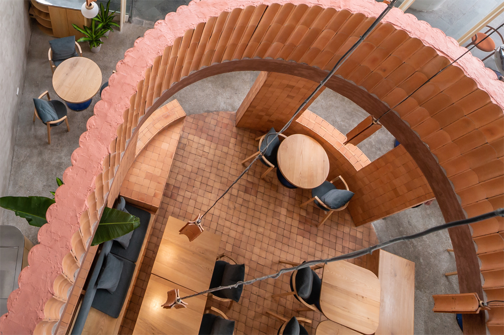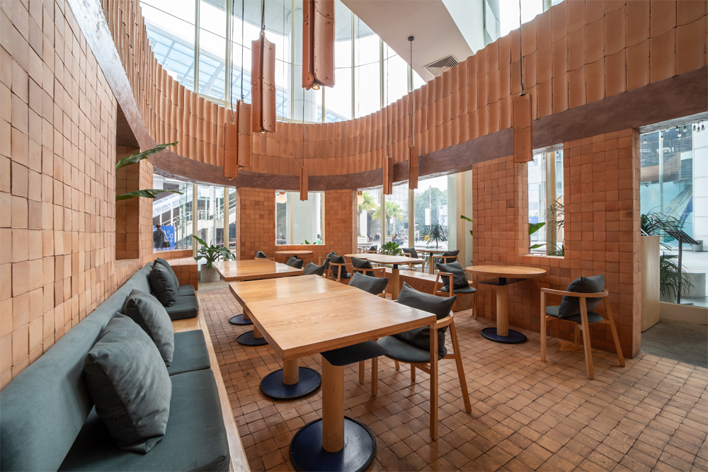 Một phần không gian tại tầng hai được nâng cao hơn so với cốt không gian giao thông chung của toà nhà, điều này tạo cho thực khách sự riêng tư và cũng không mất đi tính kết nối bởi ranh giới mềm là dải cây xanh.