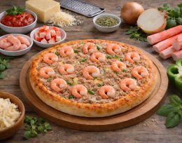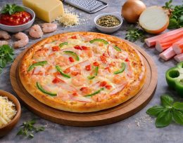 Thanh cua, tôm, ớt xanh, hành tây, cà chua, sốt cà chua, pho mai.
