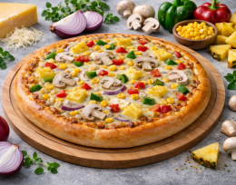 Nấm, ngô, dứa, ớt xanh, hành tây, cà chua, sốt cà chua, pho mai.