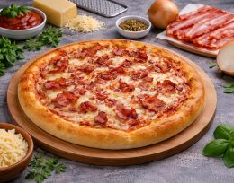 Ba chỉ xông khói, sốt cà chua, phomai, hành tây