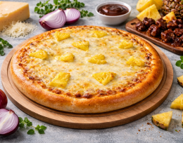 Thịt bò xay, dứa, sốt BBQ, pho mai.