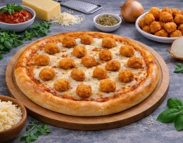 Gà viên popcorn, hành tây, sốt cà chua, phomai