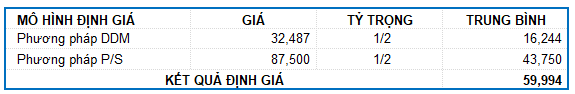 Kết hợp hai phương pháp Dividend Discount Model (DDM) và P/S với tỷ trọng tương đương, ta được mức giá hợp lý của doanh nghiệp là 59,994 đồng. Như vậy, mức giá thị trường hiện tại đang thấp hơn khoảng 30% so với kết quả của mô hình và khá thích hợp cho đầu tư dài hạn.