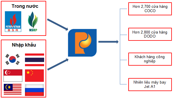 PLX phân phối sản phẩm xăng dầu thông qua 3 kênh: kênh hệ thống đại lý/Tổng đại lý (DODO), kênh bán lẻ (COCO) và kênh khách hàng công nghiệp. Đến nay, PLX vẫn đang có lợi thế vượt trội so với các đối thủ cạnh tranh khi có tới 43 đơn vị thành viên trực tiếp kinh doanh xăng dầu trong nước và hơn 5,500 cửa hàng xăng dầu hiện diện trên khắp cả nước (hơn 2,700 cửa hàng bán lẻ trực thuộc trực tiếp và hơn 2,800 cửa hàng đại lý) tạo điều kiện thuận lợi để sản phẩm, dịch vụ của PLX dễ dàng tiếp cận người tiêu dùng hơn.