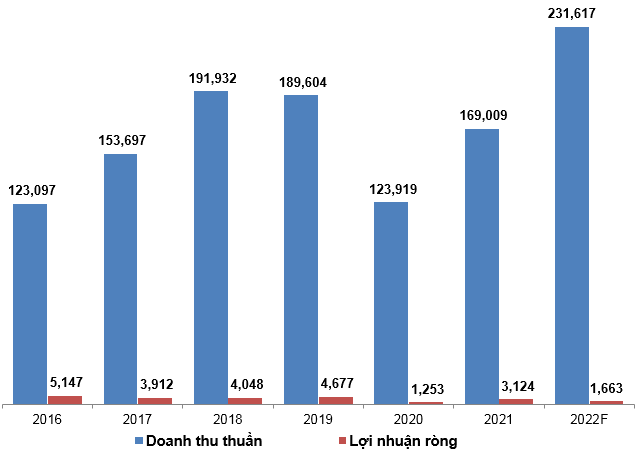 Doanh thu thuần và lợi nhuận ròng của PLX giai đoạn 2016-2022F. Đvt: Tỷ đồng