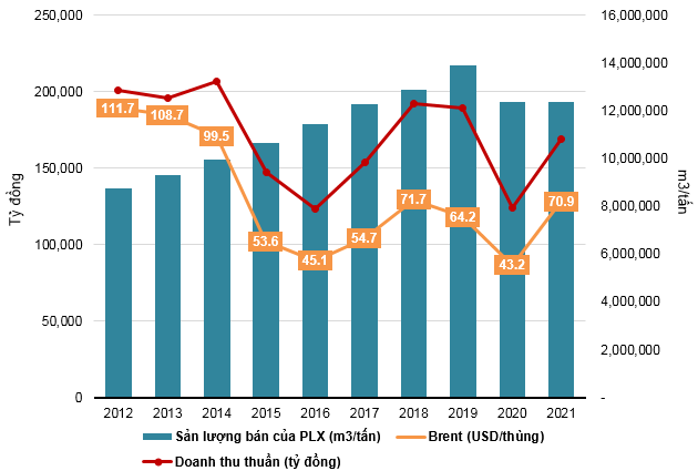 Doanh thu thuần của PLX có sự tương quan nhất định đến giá dầu Brent thế giới khi biến động khá cùng chiều. Sản lượng xăng dầu xuất bán toàn tập đoàn PLX tăng trưởng khá đều giai đoạn từ năm 2012-2019. Do các vấn đề về dịch bệnh nên sản lượng sụt giảm và đi ngang từ năm 2020-2021. Theo người viết dự đoán sản lượng sẽ hồi phục trở lại kể từ năm 2022 khi các hoạt động sản xuất đã trở lại bình thường.