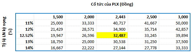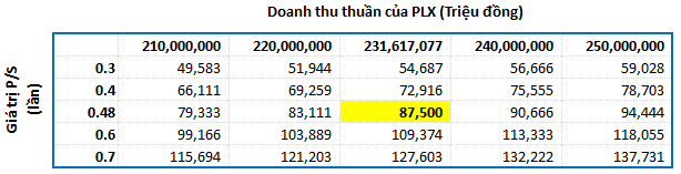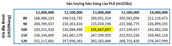 Bảng phân tích độ nhạy doanh thu của PLX. Đvt: Triệu đồng