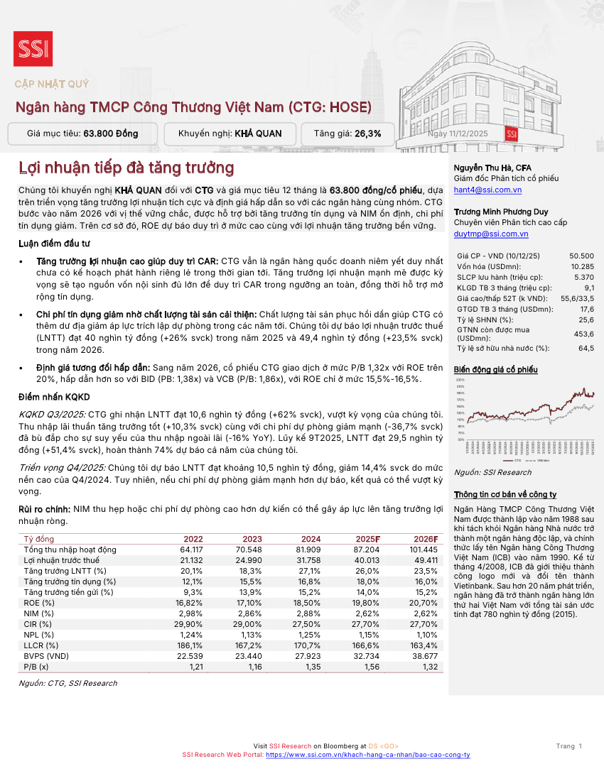 CTG: Khuyến nghị KHẢ QUAN với giá mục tiêu 63,800 đồng/cổ phiếuNguồn: SSI Tải về 11/12/2025 |
