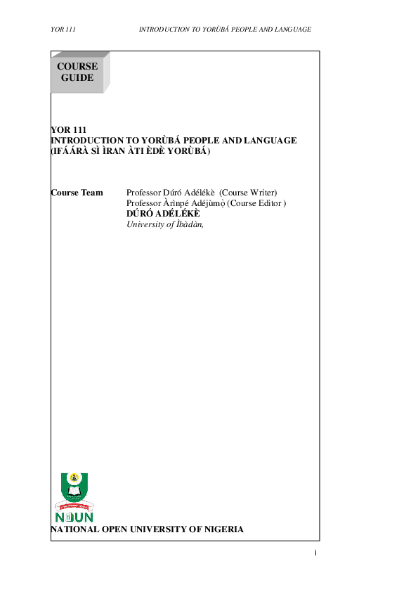 arrow_back_iosi YOR 111 INTRODUCTION TO YORÙBÁ PEOPLE AND LANGUAGE (IFÁÁRÀ SÌ ÌRAN ÀTI ÈDÈ YORÙBÁ) Course Team Professor Dúró Adélékè (Course Writer) Professor Àrìnpé Adéjùmo ̣ ̀ (Course EditorBABATUNDE OLASAYO POPOOLAdownloadDownload free PDFAbstract