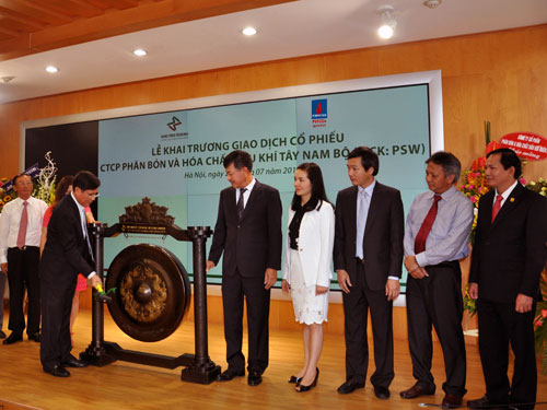 | Ông Lê Minh Hồng- Phó Tổng giám đốc Tập đoàn Dầu khí đánh cồng khai trương phiên giao dịch đầu tiên của cổ phiếu PSW. |