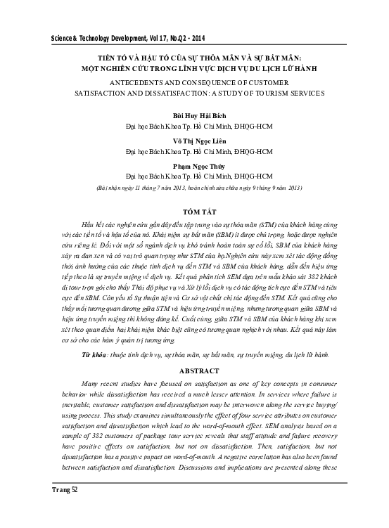 Đề tài nghiên cứu được thực hiện năm 2015, với quy mô mẫu khảo sát 207 nhân viên đang làm việc tại trường Đại học Sư phạm Kỹ thuật TP. HCM. Với mô hình nghiên cứu bao gồm 8 biến độc lập: Lương bổng; Cơ hội thăng tiến; Giám sát; Phúc lợi xã hội; Hệ thống quản lý; Đồng nghiệp; Tính chất công việc; Hệ thống thông tin và giao tiếp. Đề tài đã xác định được 6 yếu tố tác động đến sự hài lòng trong công việc của người lao động tại nơi nghiên cứu. Ngoài ra đề tài còn phát hiện ra có sự khác biệt trong cách nhìn nhận, đánh giá các yếu tố ảnh hưởng đến sự hài lòng trong công việc của các nhóm người lao động khác nhau. Abstract This research was conducted in 2015, with a sample size of 207 employees are working at the HCMCUniversity of Technology and Education. The research model included 8 independent variables: Wages; Promotion opportunities; Supervisor; Welfare; Management system; Colleague; Nature of work; Information systems and communication. The study has identified six factors that affect the job satisfaction of employees. The Study also found there are differences in perception and evaluation of factors affecting job satisfaction of different groups of employees. Từ khóa:Sự hài lòng trong công việc, Các yếu tố ảnh hưởng đến sự hài lòng trong công việc. 1. GIỚI THIỆU 1.1. Tầm quan trọng của nghiên cứu Rất nhiều những nghiên cứu về sự hài lòng của nhân viên đã chứng minh rằng sự hài lòng trong công việc của nhân viên ảnh hưởng đến hiệu quả thực hiện công việc, hành vi tại nơi làm việc, mức độ gắn kết của nhân viên với tổ chức. . Với vai trò đó, sự hài lòng trong công việc của người lao động rất cần được coi trọng và nâng cao đối với mỗi một tổ chức. Để nâng cao được sự hài lòng trong công việc, trước hết phải xác định được các yếu tố có ảnh hưởng quyết định đến sự hài lòng của nhân viên. Khi đó, tổ chức mới có biện pháp tác động cụ thể và có hiệu quả. Góp phần tạo ra một tổ chức hoạt động có hiệu quả cao. Là một trường đại học lớn ở khu vực phía nam, Đại học Sư phạm Kỹ thuật TP.HCM với hơn 50 năm phát triển, danh tiếng đang ngày một được khẳng định. Để có sự phát triển bền vững, một trong những yếu tố cần thiết hàng đầu là một đội ngũ nhân lực có trình độ chuyên môn cao và cống hiến hết mình cho sự nghiệp giáo dục tại trường. Với mong muốn góp phần tìm ra những yếu tố quyết định đến sự hài lòng trong công việc của đội ngũ nhân lực đang làm việc tại trường, tác giả tiến hành thực hiện nghiên cứu đề tài này.