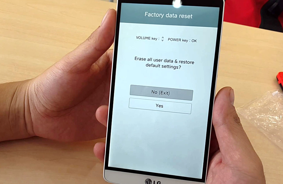 Khi logo LG xuất hiện, chỉ bỏ tay ra khỏi nút nguồn, sau đó nhấn lại ngay. Ngón tay kia thì vẫn liên tục đè lên phím giảm âm lượng không được rời ra. Màn hình Factory Reset sẽ xuất hiện, nhấn phím giảm âm lượng để chữ Yes sáng lên, sau đó nhấn phím nguồn để tiếp tục