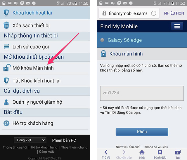Find My Mobile là công cụ cho phép bạn tìm lại chiếc điện thoại của mình lỡ như nó có bị thất lạc, ngoài ra nó còn được tích hợp tính năng gỡ bỏ password màn hình khóa để dùng trong những tình huống như thế này. Bằng cách dùng Find My Mobile, bạn sẽ tạm thời vô hiệu hóa màn hình khóa và vào thẳng hệ điều hành, sau đó bạn có thể thiết lập lại password mới. Lưu ý là cách này chỉ áp dụng nếu bạn đã đăng nhập tài khoản Samsung Account vào thiết bị của mình, còn không thì mời xem cách 3. Cách làm như sau: Dùng máy tính hay một cái điện thoại khác truy cập vào trang web này https://findmymobile.samsung.com/ Đăng nhập tài khoản Samsung Account của bạn vào web, nhớ là xài cùng tài khoản với trên điện thoại