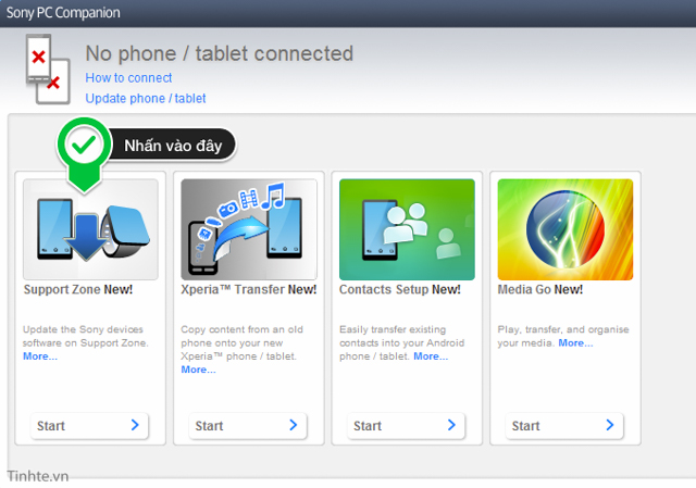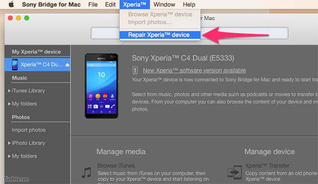 Ở mục "Phone / Tablet Software Update", nhấn Start Kết nối điện thoại, tablet Sony vào máy tính bằng cáp USB, sau đó nhấn nút "Repair" Làm theo hướng dẫn trên màn hình để chạy lại firmware trên điện thoại của bạn Với Sony Bridge trên Mac OS X: Cài đặt phần mềm Sony Bridge for Mac vào máy tính của bạn Chạy ứng dụng Sony Bridge for Mac, kết nối điện thoại vào máy tính bằng cáp USB Vào menu Xperia (cạnh trên màn hình) > Repair Xperia device > Continue