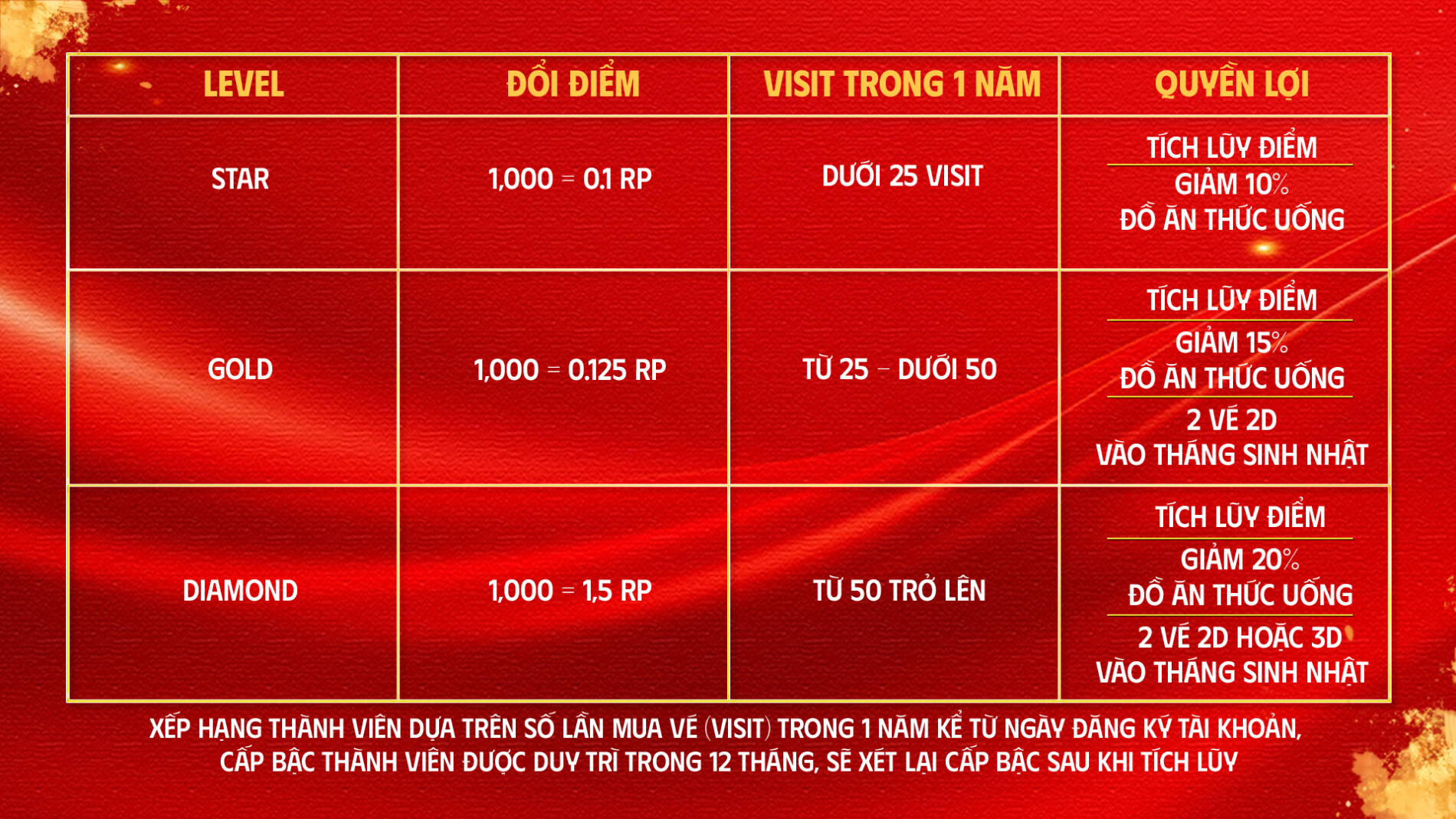 - Khách hàng Gold và Diamond cần xuất trình tài khoản thành viên và giấy tờ tùy thân để nhận quà trực tiếp tại rạp. Quà tặng không thể chuyển nhượng hoặc nhận quà thay.