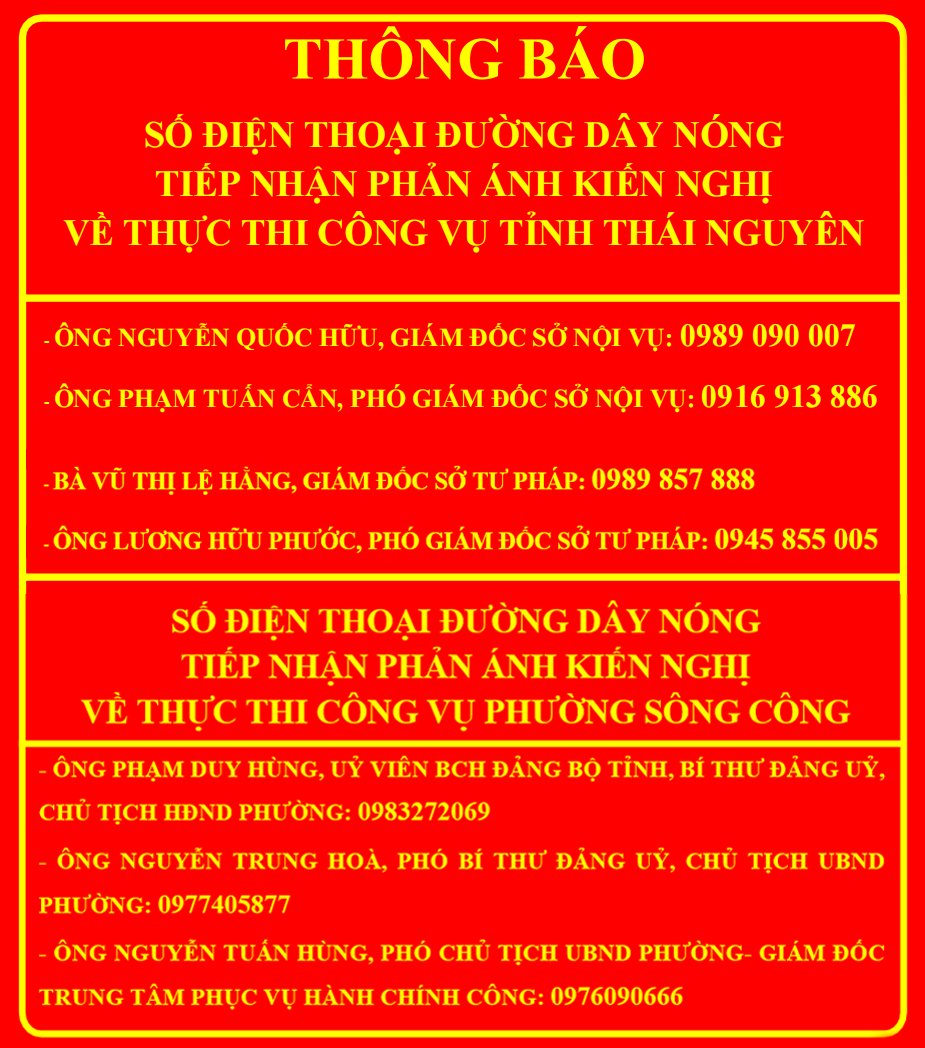 | TRANG THÔNG TIN ĐIỆN TỬ PHƯỜNG SÔNG CÔNG TỈNH THÁI NGUYÊN Cơ quan chủ quản: UBND PHƯỜNG SÔNG CÔNG Địa chỉ: Số 1, đường Trần Phú, Phường Sông CôngTrưởng Ban Biên tập: Email: [email protected] - Điện thoại: 0208 3 862 238, Fax: 0208 3 862 439 * Ghi rõ nguồn: Trang thông tin điện tử phường Sông Công "https://songcong.thainguyen.gov.vn" khi phát hành lại thông tin từ website này |