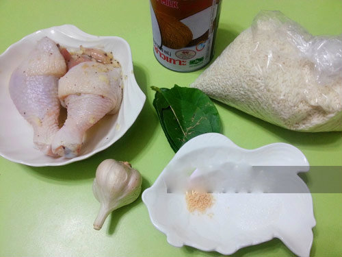 Nguyên liệu: - 2 cái đùi gà rửa sạch với giấm và muối thấm khô (bạn có thể cho cả con gà vào nếu muốn) - 250gr gạo nếp vo sạch ngâm nước 6-8 tiếng - Vài cái lá chanh rửa sạch thái chỉ, 5 tép tỏi băm nhỏ - 3 thìa nước cốt dừa - Gia vị ướp thịt: muối, tiêu, bột nêm, xíu đường - 1/2 bó hành lá rửa sạch thái nhỏ
