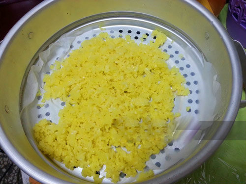 Khi xôi chín, rải xôi lên khay đã bọc nilon