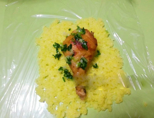 - Bắt xửng hấp (nồi hấp) đặt lên bếp nước thật sôi. Cho nếp vào xửng, phía trên nếp đặt con gà ướp lên trên. Hấp gà và nếp khoảng tầm 15 phút cho gà vừa chín tới thì bạn lấy con gà ra. Hấp xửng tiếp đến khi gạo nếp chín mềm thành xôi, trong thời gian hấp xôi nếp bạn có thể nêm nếm lại xem xôi là vừa ăn chưa. - Khi lấy miếng gà ra để ra rổ cho thịt gà se mặt. - Trải nilong bọc (màng bọc thực phẩm) hoặc giấy bạc thức ăn lên khay, khi xôi chín các bạn rải xôi lên khay đã bọc nilong , chiều dày xôi trải ra khoảng 1,5 cm, nén cho xôi dàn đều và chặt