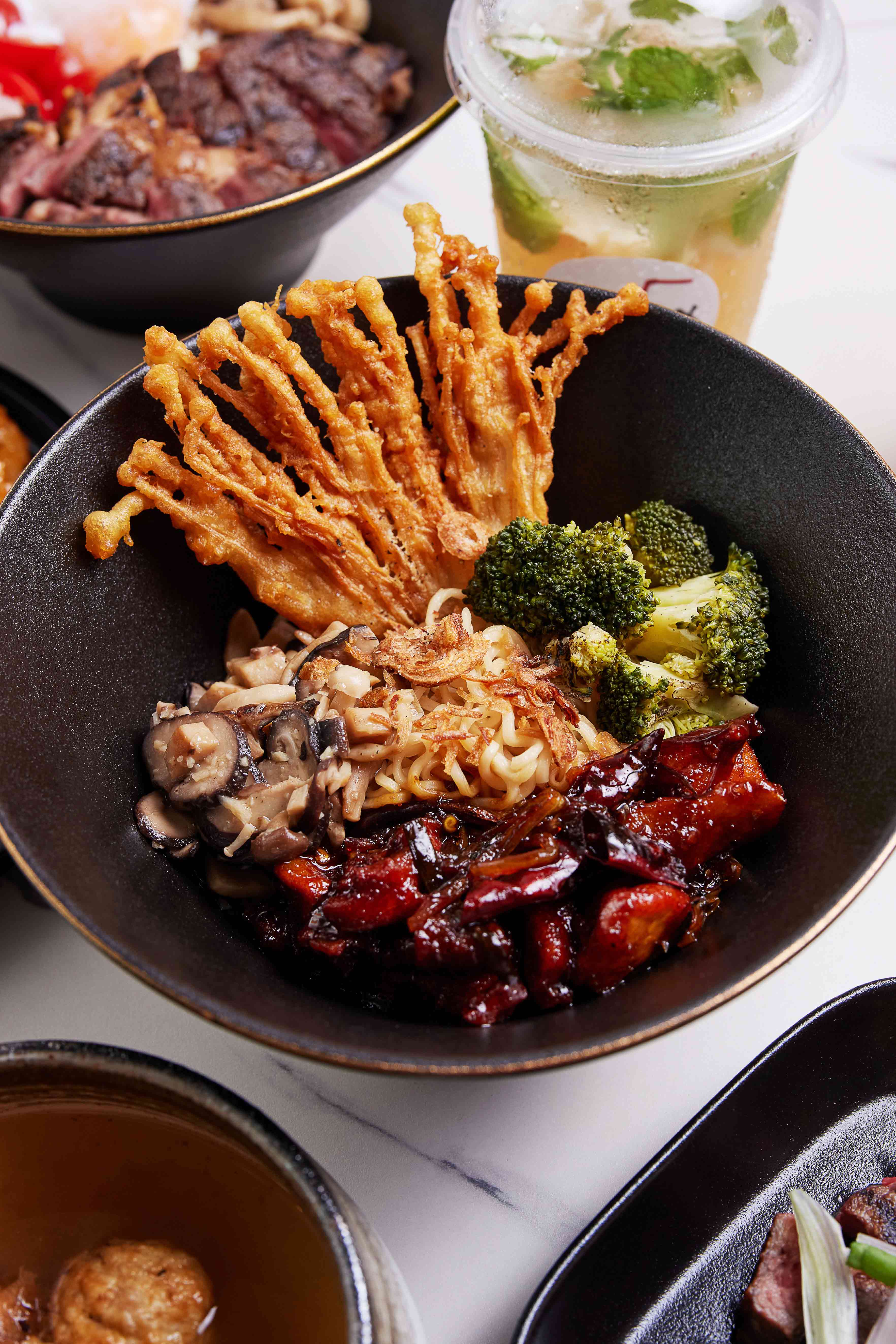 This one’s a fancied up instant noodle combo, featuring addictive Koka noodles tossed in scallion oil, and sides of charred broccoli, sauteed mushrooms, and deep-fried enoki tempura. The stellar tempura boasts an unbelievably light and crispy batter – the only downside is it outshines the mushrooms within. As for the meat, the kung pao sauce has been tweaked to be sweeter and less spicy, with the result that the chicken thigh pieces look and taste a little bit like char siew, albeit with a pepperiness at the end.
