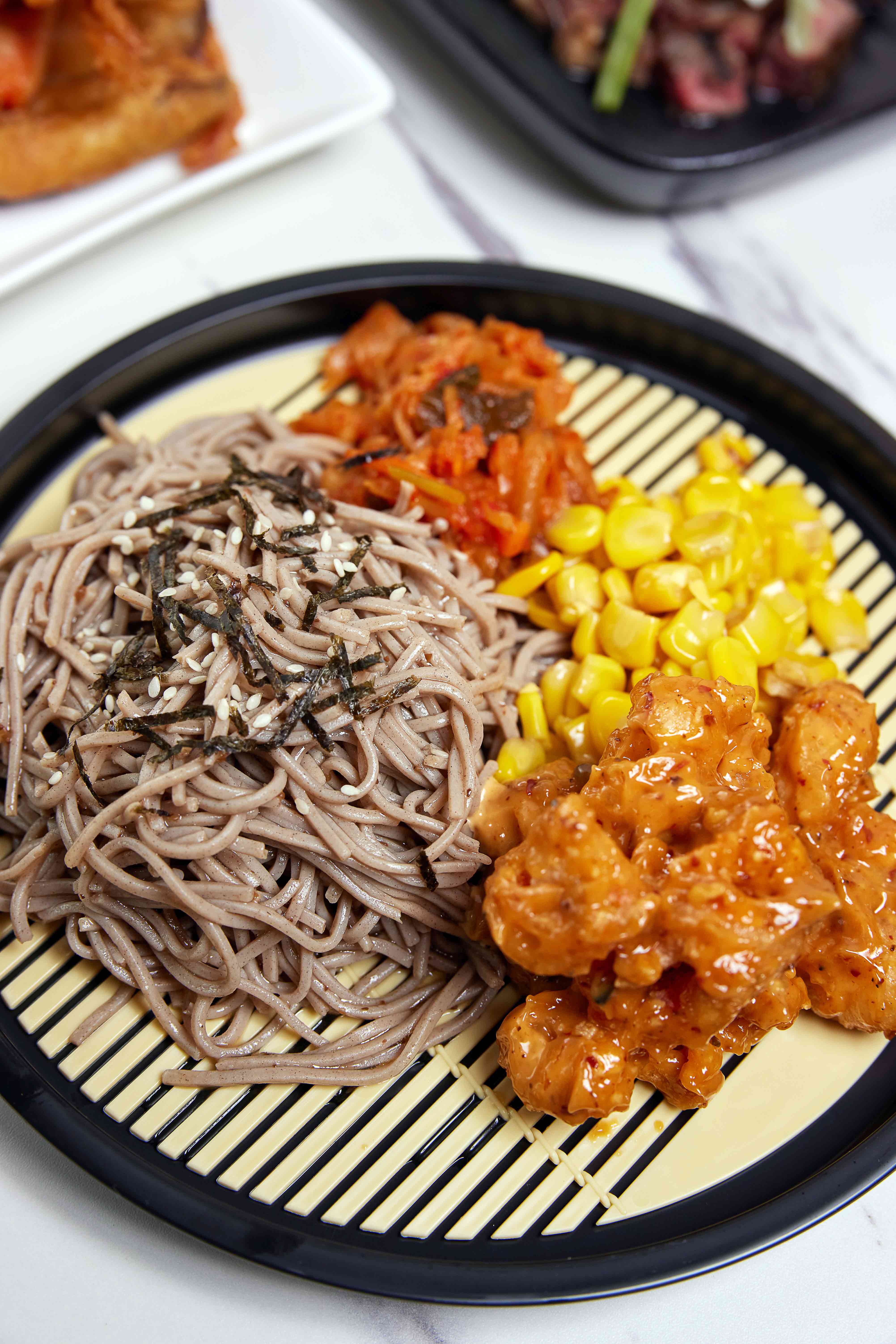 With each order comes a base of rice, noodles like soba or lettuce, plus two toppings: choose from 10 options including corn, broccoli and cherry tomatoes. Additional toppings at $1 each.